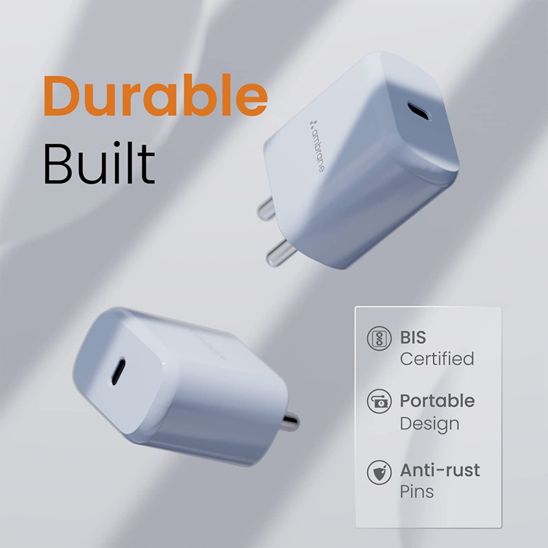 20W Boosted Speed - Charge up your devices and experience Ambrane’s BoostedSpeed technology with RAAP M20; PD Fast Charging - This charger gives an ultra-fast charging experience with its special Power Delivery (PD) Technology.