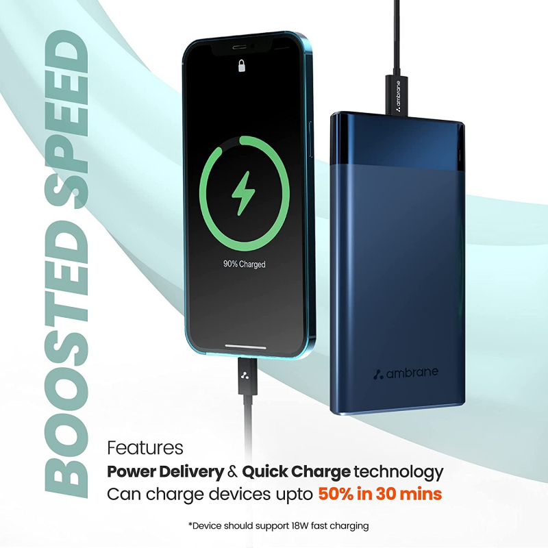 إدخال شحن سريع بقدرة 20 واط - يمكن شحن بنك الطاقة نفسه في غضون 4 إلى 5 ساعات لأنه يحتوي على تقنية توصيل الطاقة التي تدعم إدخال الشحن السريع بقدرة 20 وات عبر منفذ من النوع C.