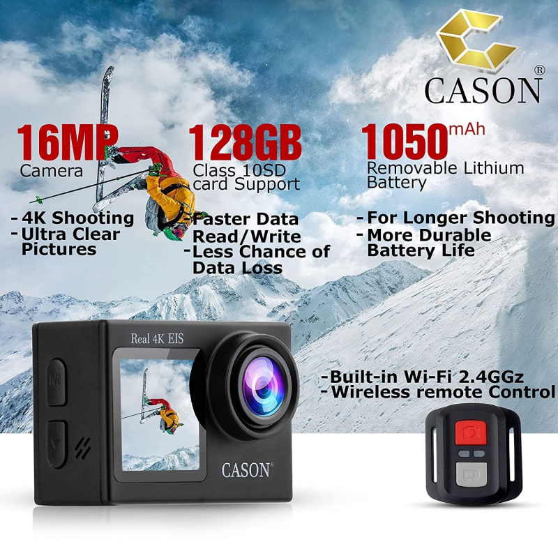 CASON CS6 Real 4K كاميرا رياضية مزدوجة الشاشة مقاومة للماء