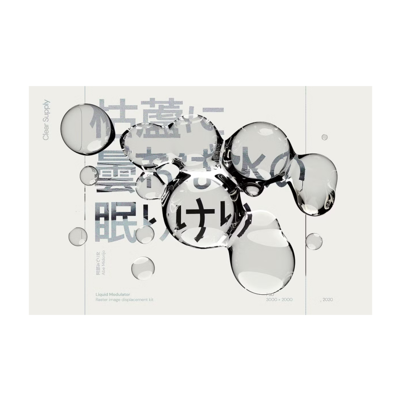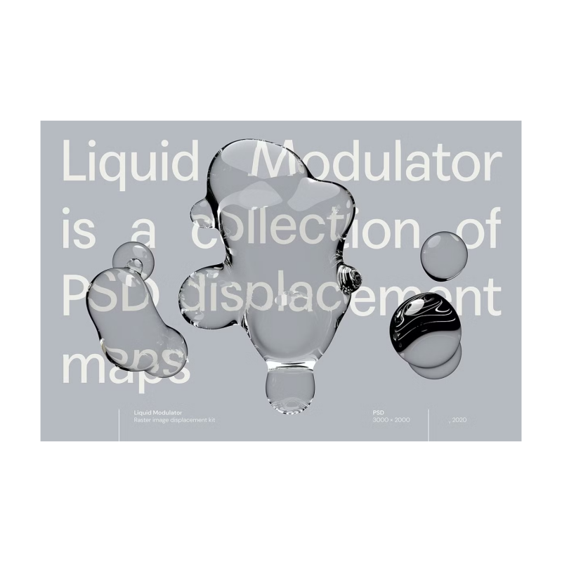 Liquid Modulator is a collection of 60 unique high-resolution renders with an alpha channel. You can use them to bring dynamics to your designs by simply displacing your image in Photoshop and overlaying a render over it. At 3000 × 2000 px, the collection is suitable for both screen and print. For unique compositions, combine your elements in the collection. The package contains 60 renders (PSD, PNG) + 60 previews (JPG).